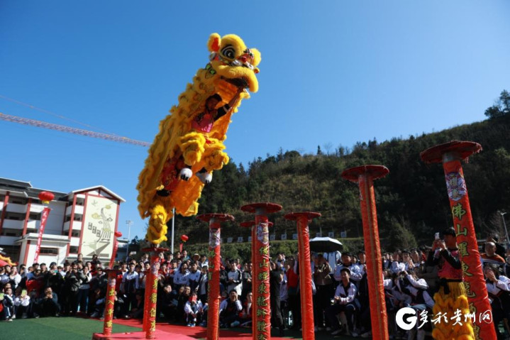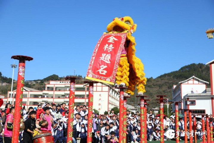 在东西部协作教育组团式帮扶团队牵线搭桥下,广东省佛山市耀东龙狮团专程来给剑河高考学子送祝福,以精湛绝伦的技艺为高考学子加油助威,祈愿他们在高考中金榜题名、旗开得胜。随着铿锵鼓点,两头象征吉祥的“狮子”跃上高台,腾挪翻飞,跳跃、腾挪、闪扑、飞跃等动作一气呵成,展现出蓬勃的生命力与昂扬的精气神。随后,双狮攀爬上高杆,口中吐出的“金榜题名”字样时,现场喝彩声、掌声此起彼伏,交织成一曲欢快热烈的青春赞歌。